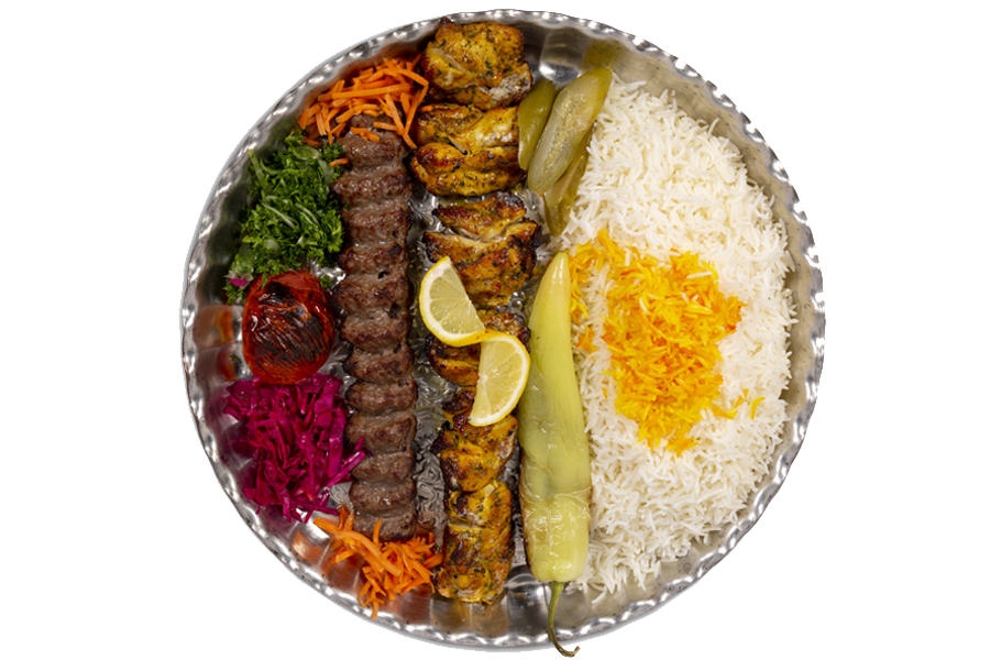 1 skewer of Chicken Leg Kebab, 1 skewer of Chicken Breast Kebab, 2 skewers of Koobideh Kebab, 2 rice servings