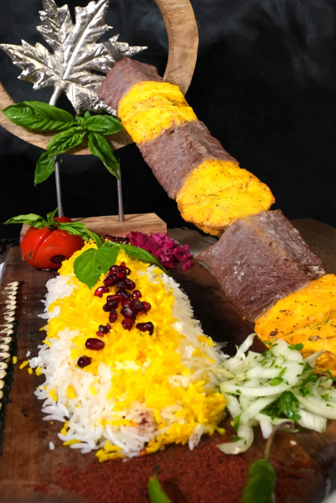 Marinated beef in a tangy pomegranate and herb sauce, grilled the traditional Gilaki way. Served with saffron rice.